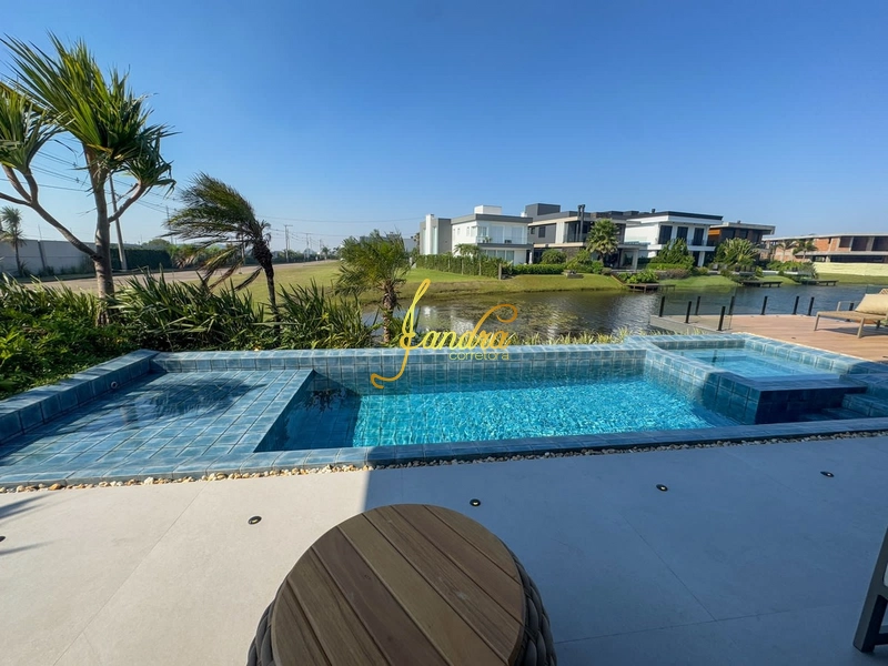 Sobrado em condomínio fechado SENSE, este sobrado tem uma arquitetura moderna, com 417m2 de área construída, composto por 5 amplas suítes, uma sendo master com closet, uma sendo térrea, estar intimo, climatizada, toda automatizada, Living em conceito aberto amplo com pé direito duplo e lareira, elevador, cozinha com espaço gourmet com churrasqueira, lavabo e lavanderia, dependência de empregada completa, piscina em concreto. Belíssimo paisagismo com sistema de irrigação e iluminação, abrigo para 02 carros. Estuda recebe imóvel no litoral em até 30% do valor, e estuda um parcelamento. Valor sujeito a alteração sem aviso prévio.